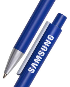 Caneta esferográfica plástica com detalhe texturizado. Aciona por clique.