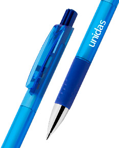 Caneta Plástica com acionamento por rotação e carga esferográfica azul 1.0mm.
