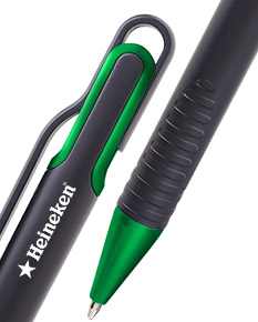 Caneta esferográfica plástica, com corpo na cor preto e acionamento por clique.