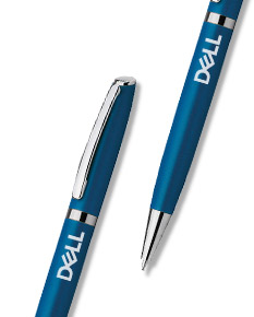 Caneta metálica com touch screen, carga esferográfica azul e acionamento por rotação.