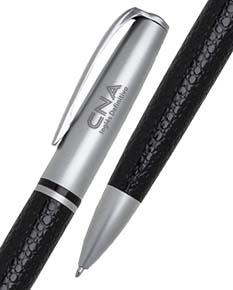 Caneta metálica com elegante detalhe em couro sintético, ideal para quem busca sofisticação na escrita. Possui carga esferográfica azul e acionamento por rotação. Design refinado, confortável e durável, perfeita para uso profissional ou para presentear.