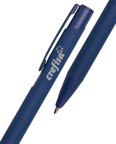 Caneta com corpo metálico, ponteira e clip em plástico. Possui acionamento por clique e carga esferográfica azul de 1.0mm, oferecendo uma escrita suave e precisa com pegada leve e confortável para o uso diário.