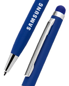 Caneta esferográfica em metal touch com escrita na cor azul. Acionamento giratório.