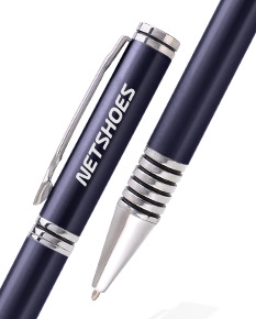 Caneta metálica com acionamento por clique e clip em plástico. Possui carga esferográfica azul de 1,0mm.