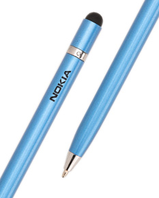 Caneta metálica com detalhe emborrachado no topo, ideal para uso em dispositivos com telas sensíveis ao toque. Possui acionamento por rotação e carga esferográfica azul de 1,0mm.