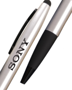 Caneta metálica com carga esferográfica azul de 1,0mm e acionamento por clique de revestimento emborrachado para interação em dispositivos com telas sensíveis ao toque.