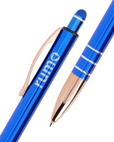 Caneta elegante com corpo em metal, escrita na cor azul. Compatível com refil padrão tipo Parker. Possui ponta touch emborrachada para uso em telas sensíveis ao toque. Observação: Não acompanha refil, apenas a caneta.