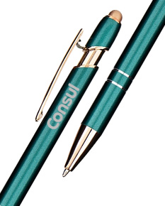 Caneta metálica moderna, com detalhe emborrachado no topo, ideal para interação com dispositivos de telas sensíveis ao toque. Possui acionamento por clique e carga esferográfica azul de 1,0 mm, garantindo escrita macia e precisa. Um brinde corporativo elegante, funcional e alinhado à rotina digital.