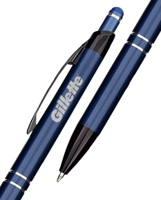 Caneta em metal com design moderno, possui clip e ponta em plástico, além de detalhe emborrachado no topo para interação com dispositivos de telas sensíveis ao toque. Conta com acionamento por clique e carga esferográfica azul de 1,0 mm, oferecendo escrita confortável e precisa. Ideal como brinde corporativo funcional e elegante.
