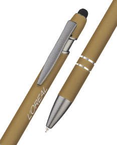 Esferográfica em alumínio com mecanismo twist e ponteira touch. Escrita a azul. Fornecida com bolsa em cartão