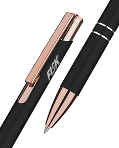 Caneta esferográfica em metal com escrita azul e acabamento brilhante, que destaca seu visual moderno e elegante. Possui detalhe em dourado rosé que agrega sofisticação ao design. Uma peça funcional e refinada, ideal para brindes corporativos que valorizam estilo, qualidade e boa apresentação.