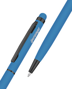 Caneta esferográfica de metal com escrita em azul e ponta touch para uso em telas sensíveis ao toque. Possui corpo emborrachado que proporciona pegada confortável e firme durante a escrita. O detalhe preto agrega contraste moderno ao design, valorizando o acabamento da peça. Ideal para uso profissional e ações promocionais, unindo tecnologia, elegância e funcionalidade em um único produto.