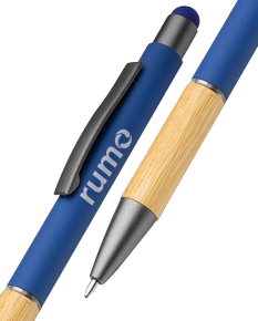 Caneta esferográfica em alumínio reciclável com escrita em azul. Detalhe em bambu. Refil parker e ponta touch emborrachada.