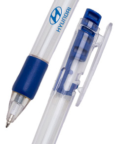 Caneta plástica inteira transparente com detalhes emborrachado e clip coloridos. Possui dois traços vazados na parte superior e acionador com detalhes em relevo. Aciona por clique, para destravar bastar pressionar o clip.
