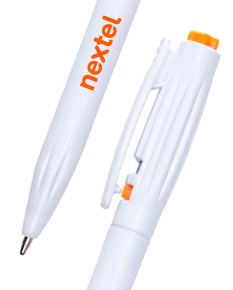 Caneta plástica branca com detalhe colorido. Possui detalhes em relevo na parte superior ao redor do clip, parte inferior com detalhes em relevo. Aciona por clique e para destravar basta apertar a parte inferior do clip.