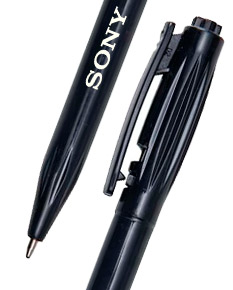 Caneta esferográfica plástica, com corpo na cor preto e acionamento por clique.