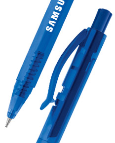 Caneta esferográfica plástica, com corpo translucido e com acionamento por clique,Disponivel também na cor azul fosco
