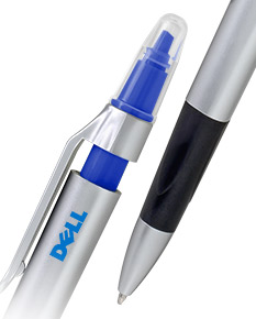 Caneta plástica esferográfica e marca texto. Caneta esferográfica com acionamento por clique.