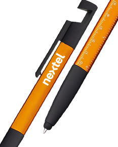 Caneta plástica triangular com ponteira emborrachada para interação em dispositivos de telas sensíveis ao toque. Possui clip com revestimento em feltro no topo, ideal para limpeza de tela, além de abertura que funciona como suporte para celular. Conta ainda com marcação de régua de 7 cm no corpo, acionamento por rotação e carga esferográfica azul de 1,0mm.