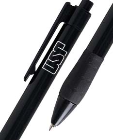 Caneta plástica com detalhe emborrachado para maior conforto, tinta esferográfica azul e acionamento prático por clique.