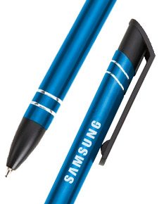 Caneta semimetal colorida com anéis prata e detalhes em preto. Clip plástico preto, possui quatro anéis, sendo dois superiores e dois inferior. Aciona por clique.
