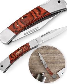 Canivete com lâmina em aço inox e cabo em bambu, equipado com fecho de segurança para maior proteção durante o uso. Possui cordão para facilitar o transporte, sendo uma opção prática e funcional para atividades ao ar livre.