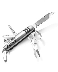 Canivete de metal com 9 funções. Contém lâmina de corte, serrilha, mini tesoura, abridor de latas, abridor de garrafa, chave phillips, lixa, agulha de sutura e saca rolhas.