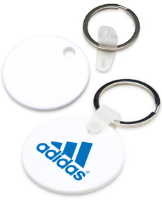 Chaveiro de acrílico em formato redondo, frente verso e liso. Possui prendedor de plástico que conecta a argola metálica.