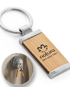 Chaveiro retangular confeccionado em madeira de faia, que combina resistência e elegância natural. Conta com acabamento liso e argola metálica em ferro, garantindo durabilidade e um toque sofisticado. Ideal como brinde corporativo ou acessório pessoal.