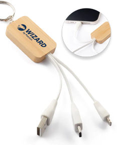 Chaveiro de capa de bambu com cabo para carregamento USB-A a Micro-B (2 em 1 pinos) e Tipo C. Como o bambu é um material natural, a cor do item pode variar.