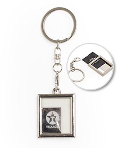 Chaveiro porta-foto em inox. Possui uma fina capa transparente removível para proteger a foto e corrente com gancho preto ao chaveiro.