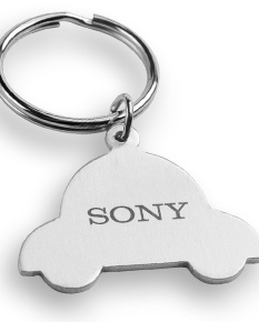Chaveiro metal formato carro com detalhes preto em relevo e verso espelhado.