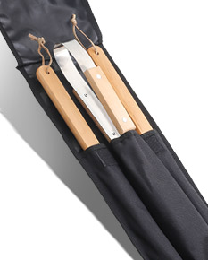 Kit Churrasco com 3 peças e tábua de bambu.