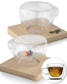 Conjunto com dois copos de vidro borossilicato de parede dupla, com capacidade de até 60 ml, ideal para espressos. Acompanha apoios de bambu para os copos e vem em uma caixa presenteável, oferecendo uma experiência sofisticada para apreciadores de café.