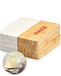 Conjunto de 4 porta copos em mármore e bambu em formato quadrado. Cada peça individual está dividida, pela sua metade, em mármore e bambu. Fornecido em caixa presente em papel kraft reciclado. Certificação EU Food Grade. A cor e o resultado da impressão nos materiais naturais pode variar entre produtos. 100 x 100 x 10 mm