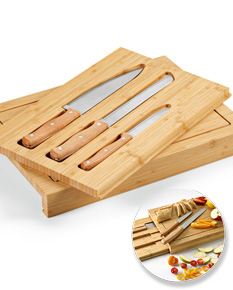 Conjunto de tábuas em bambu com 3 facas inclusas. Composto por duas tábuas: a tábua exterior e a tábua interior que assume duas funcionalidades - um compartimento para três facas inclusas (faca de legumes, faca de pão, faca de cozinha) e como tábua de corte.