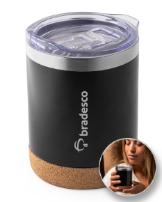Copo de viagem em aço inoxidável com parede dupla isolada a vácuo, acabamento fosco e base em cortiça (térmico). Contém uma tampa transparente com fecho deslizante. Capacidade até 400ml.