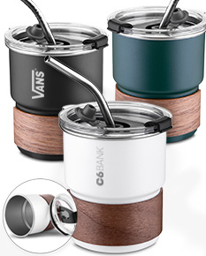 Copo de parede simples em aço inox 304 com capacidade de 250ml, com canudo em inox. Tampa em plástico poliestireno (PS) que também possui um bico como forma alternativa de uso. Com pegador em fibra de noz. Possui acabamento externo com pintura fosca.