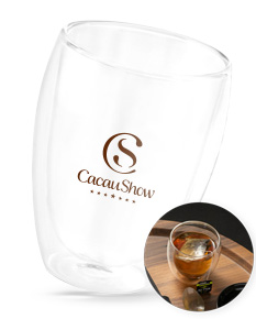 Copo em vidro borossilicato com parede dupla, isolada a ar. Capacidade até 350 mL. Fornecido em caixa presente personalizável. Certificação EU Food Grade.