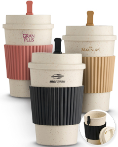 Copo de fibra de trigo de 450ml, com tampa rosqueável para evitar vazamentos. Inclui um mexedor e uma manga protetora antiderrapante. Ideal para uso diário, prático e sustentável.