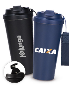 Copo em inox 304 com revestimento externo em polipropileno (PP) e capacidade para até 480ml. Apresenta tampa rosqueável em PP com protetor para o bocal. Acompanha alça em nylon com detalhe em couro sintético para transporte.