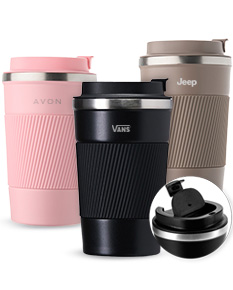 Copo térmico em inox 304 com pintura eletrostática, base antiderrapante e capacidade máxima de 350ml. Possui estrutura de parede dupla e vedação a vácuo, permitindo a conservação da temperatura de líquidos por mais tempo. Conta ainda com tampa rosqueável em plástico com trava protetora no bocal e luva removível em silicone.