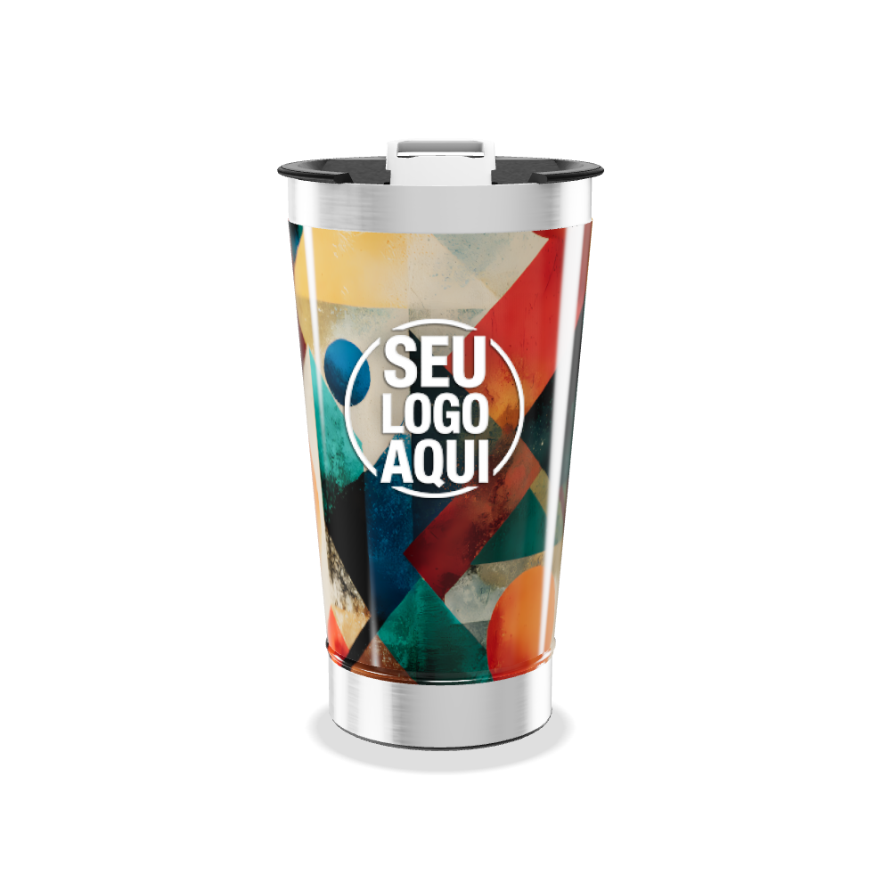 Estampa moderna: design geométrico colorido que dá um toque de estilo ao copo térmico.