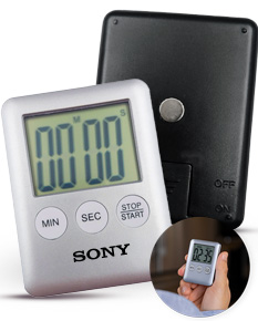 Timer digital em plástico com pintura fosca metalizada. Conta com funções progressiva e regressiva, três botões para controle da contagem, botão lateral liga/desliga, imã traseiro para superfícies metálicas e alarme sonoro de 1 minuto ao fim da contagem. Limite: 99 minutos e 59 segundos.