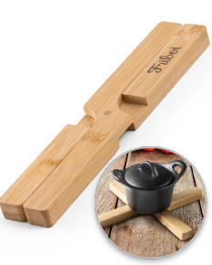 Descanso de panela dobrável em bambu.Fechado: 215 x 40 x 14 mm | Aberto: 180 x 150 x 14 mm