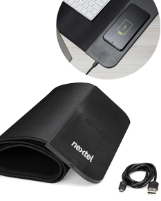 Desk Pad carregador por indução. O Produto pode ser colocado sobre a mesa com espaço suficiente para seu mouse e teclado, ainda oferecendo uma estação de carregamento wireless em sua parte lateral. O produto acompanha cabo USB e manual de instruções.