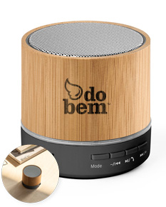 Caixa de som portátil com microfone, em bambu e ABS 100% reciclado, com transmissão sem fios BT 5.3. Tem potência de 3W, bateria com 400 mAh e autonomia aproximada de 4h30. Permite ainda as funções de atender chamadas, leitor de cartões microSD, entrada AUX e reprodução automática via porta USB-A. Incluso cabo de carregamento USB.