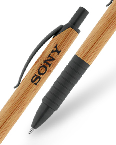 Caneta esferográfica com corpo em bambu, com detalhes na ponteira e clip plásticos. Acionamento por clic.