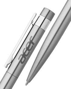 Esferográfica com corpo em aço inox 53% reciclado e clipe. A esferográfica tem escrita em azul e mecanismo twist. Fornecida numa bolsa presente em cortiça. Esferográfica: ø11 mm x 133 | Caixa: 155 x 40 mm