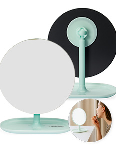 Um espelho de mesa com estilo minimalista que se adapta a diversos ambientes. Possui base fixa e pedestal giratório em 360 graus, ambos feitos em plástico, permitindo uma montagem simples e o ajuste em diferentes ângulos e posições.